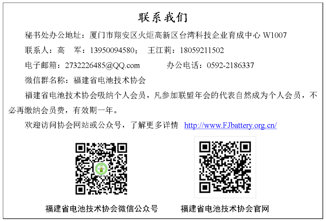 自成立以来,本会搭建了高校、研究所与企业的合作桥梁,共享信息、人才、创新平台与大型设备等资源。发挥了政府部门与电池行业之间桥梁的作用,促进了福建省电池行业的健康发展。一年一度的电池年会与《海西电池行业资讯》电子刊物已经成为本会的品牌。